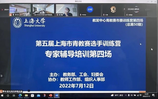 7月12日下午,为了深入落实本科教育大会精神,加强教师教学能力培训体系的顶层设计,并进一步提升我校参加市青教赛五位选手的比赛技能和水平,学校通过线上线下相结合的方式,利用假期时间举办市青教赛选手训练营的第四场校内专题培训会。本次会议特邀国青赛一等奖获得者、上海外国语大学顾秋蓓老师,国青赛一等奖获得者、上海交通大学的刘晓晶老师,上海大学原副校长、校教学咨询专家叶志明教授、校教学咨询专家文铁桥教授和刘旭光教授担任指导专家。校党委常委、副校长聂清、校工会常务副主席顾莹、教师工作部副部长孙琦琰、人事处副处长霍伟伟、校工会副主席勾金华、各教学单位的教学院长、各青教赛选手及其学院支持团队40余人参加了本次培训会。培训会由教务部副部长、教师教学发展中心主任辛明军主持。